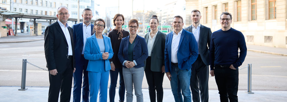 Im Bild die Partner des Programms (v.l.): Michael Baumberger (BKB), Patrick Schacher (Hoffmann & Partner), Michaela Reimann (Verein Basel2037), Sandra Borner (Pax), Celestina Rogers (Verein Basel2037), Jasmin Ott (Pax), Reto Baumgartner (Verein Basel2037), Georg Estermann (Hoffmann & Partner), Nicolai Diamant (Verein Basel2037). Foto: Cartes Fotografie