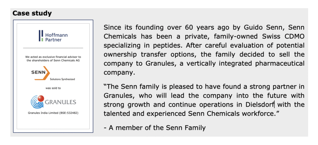 Hoffmann & Partner is an expert in advising mid-sized life science companies, in particular CDMOs, CROs and suppliers, on identifying suitable successors, preparing for investor discussions and managing international transactions with discretion, expertise and deep sector insight.
